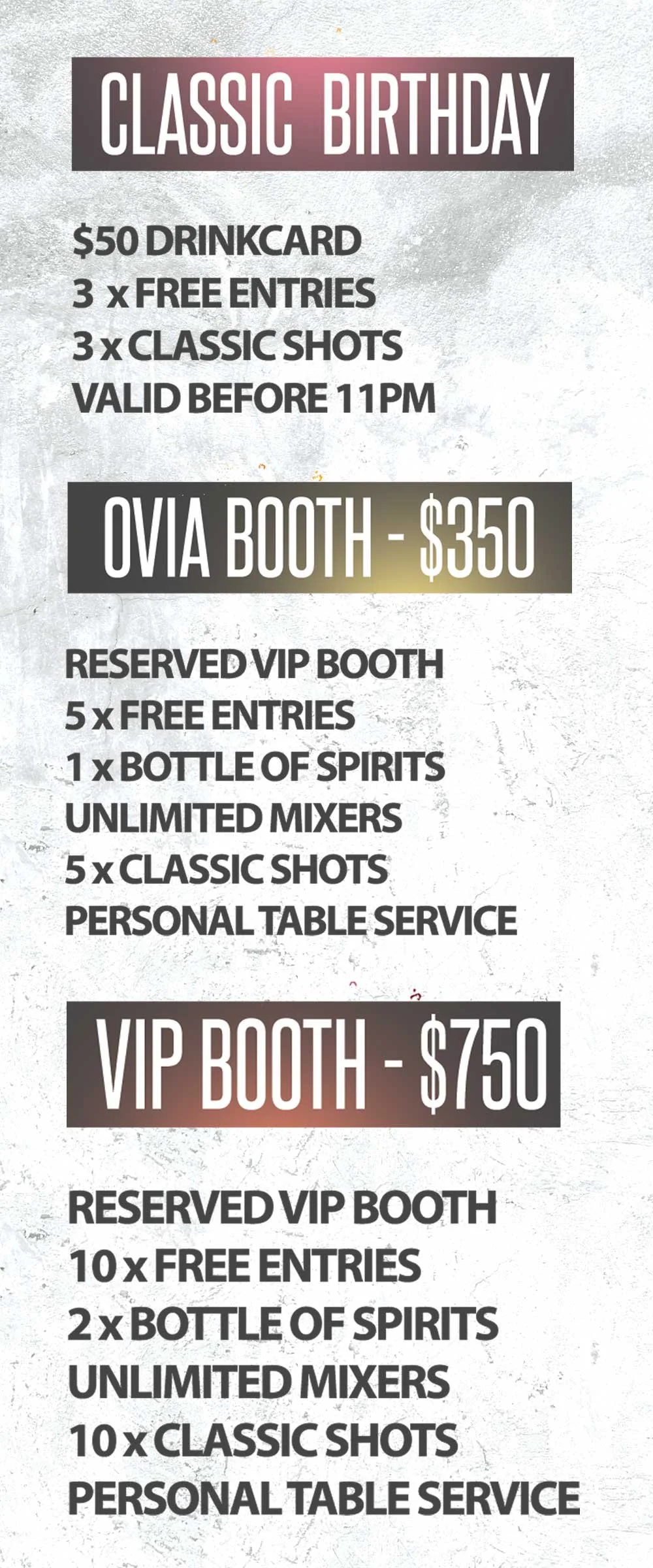 BOOKINGSSubmit a guestlist or book a booth. Ovia Bar has specialised packages for any occasion. Name * First Name Last Name Email * Phone (###) ### #### Booking Option Guestlist Classic Birthday Ovia Booth VIP Booth Date MM DD YYYY People Attending Message * Thank you! Your message has been received and one of our staff will contact you within 24-48 hours.
